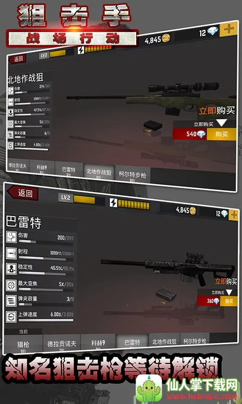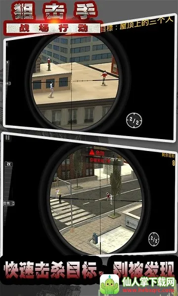 狙击手战场行动安卓版是一款狙击闯关游戏。玩家扮演狙击手执行暗杀任务,有海量关卡、数十种枪械可选。需观察目标特征,超远距离狙击,注意弹道轨迹,利用特殊设备,完成任务可获丰厚奖励,还能强化升级武器。