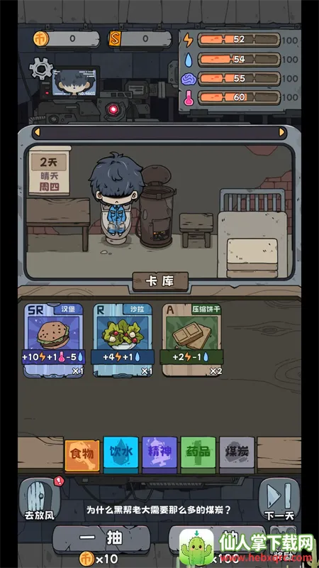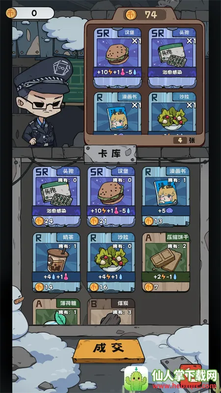 3. 多样的逃脱方式:游戏提供了保释越狱等众多逃脱方式,玩家扮演入狱倒霉蛋,为活命需寻找方法逃离囚笼。在100天内抽到100张SSR卡才能出狱,过程中要随时注意身体状态,通过抽卡获取食物药品等生活所需,还能利用卡牌交易换取抽卡资源或其他卡牌,更好地在监狱存活。