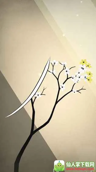 1、游戏画面采用2D剪纸风格呈现,极简优美的画风,简单干净的界面,浅褐色背景里,黑色树枝上长出白色花朵,背后红日升起,艺术格调满满。