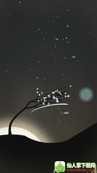 1、画面极简优美:呈现出浅褐色背景里,黑色树枝上长出白色花朵,背后红日升起的唯美意境,以2D剪纸风格展现,简单干净,只有玩家和树,极具艺术格调。