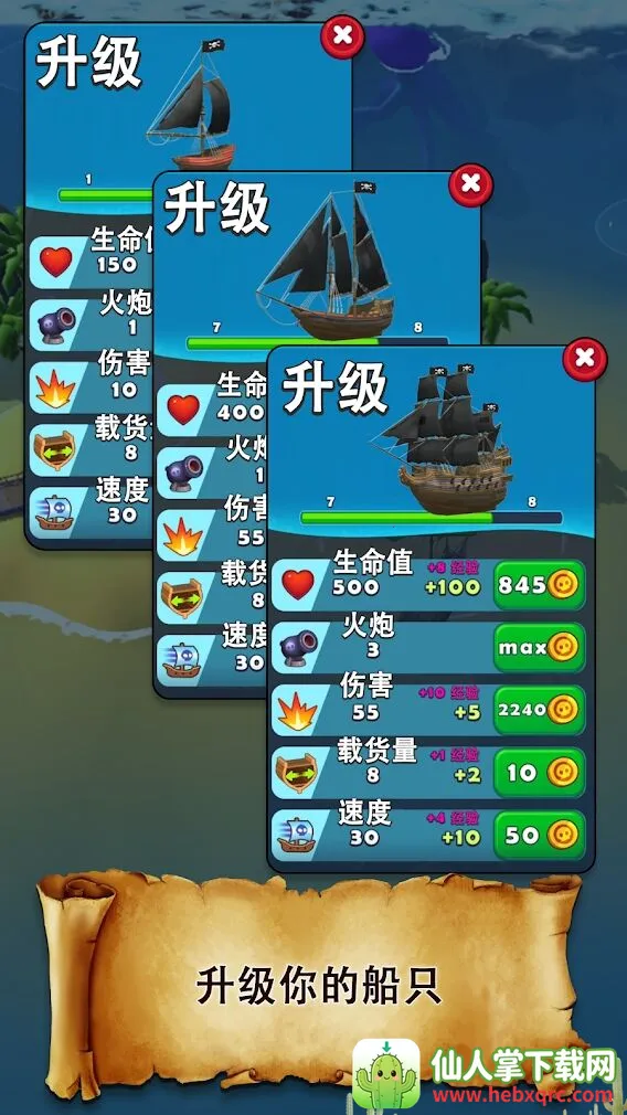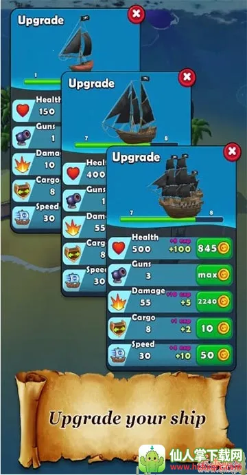 2、丰富的养成与发展:从偏僻小岛启航,招募不同职业船员增长实力,消灭海盗船或海怪获取资源,稳固发展海盗团,扩大规模到令人惊叹的地步。