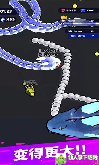 1. 吞噬成长机制:操控蛇形角色吞噬等级低于自身的其他蛇类,在激烈战场中不断成长,吞噬目标越多,食物链排名越靠前。