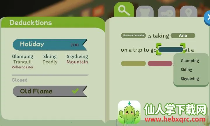 鸭鸭侦探:闹鬼露营地是款解谜游戏,免费试玩前15分钟可解锁完整版。你将扮演抑郁离婚的鸭子侦探破案,检查证据、采访嫌疑人。这是秘密萨拉米香肠独立续集,2-3小时温馨解谜,还有神秘角色配音,已修复图形问题并提升性能。