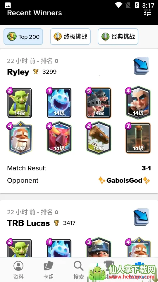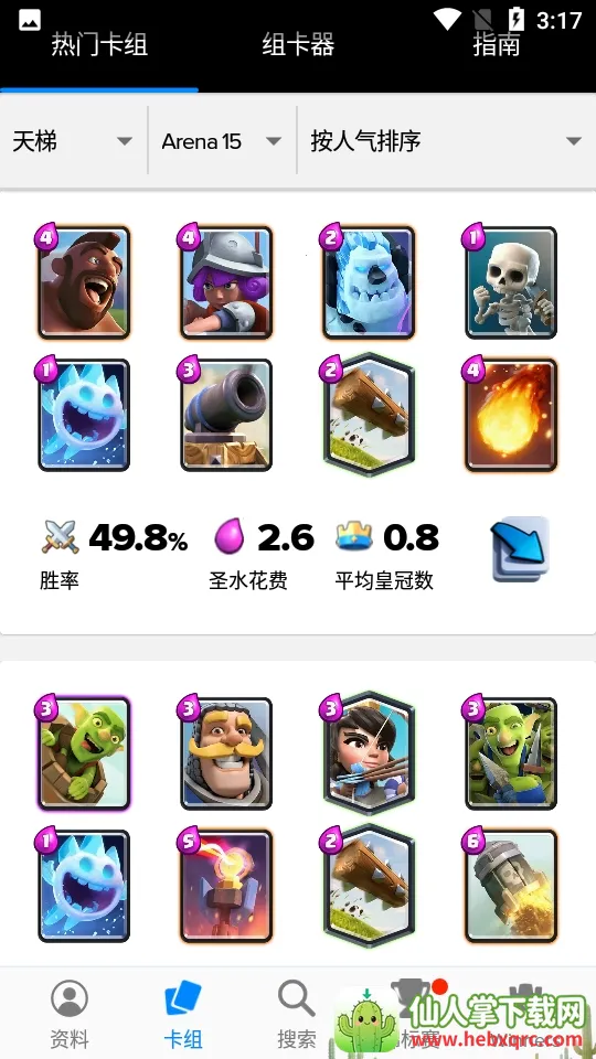 卡组主要分为热门卡组、组卡器和指南这三大块,热门卡组从天梯、竞技场等级以及人气这三个元素来筛选;组卡器就是通过你的卡牌来进行收藏;指南就是包含卡组的玩法攻略。
