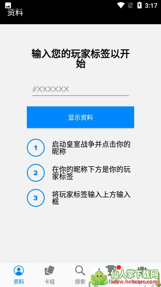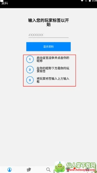 在上方显示XX的地方输入你玩家昵称下方的标签,就能显示您作为皇家战争玩家的所有资料。